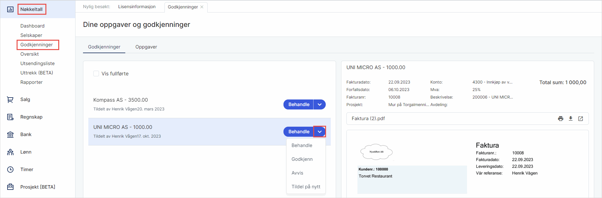 Under fanen Godkjenninger ser du hva som er tildelt deg. Du får opp en forhåndsvisning av filen på høyre side. Klikk på nedtrekkslisten for å godkjenne, avvise eller tildele på nytt. Et fjerde valg, behandle, vil bli synlig dersom din bruker har tilgang til å viderefakturere, og viderefakturering er satt opp under salgsinnstillinger på selskapet.