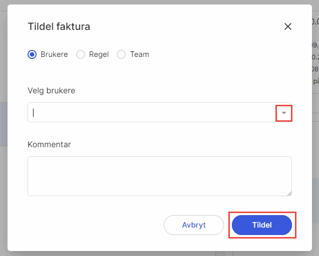 Ønsker du å tildele på nytt, kan du velge mellom å tildele til en bruker, basert på en regel eller til et team. Du velger henholdsvis bruker, regel eller team fra nedtrekkslisten. Du kan legge til en kommentar før du klikker på Tildel.