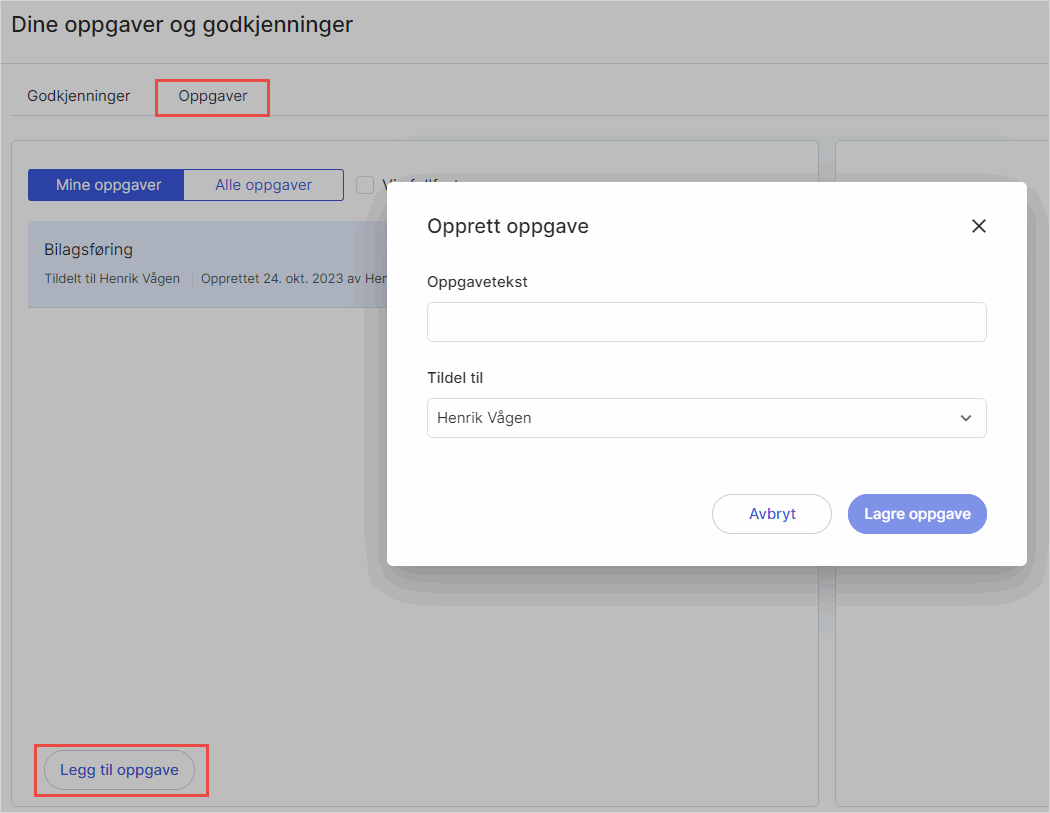 I fanen Oppgaver kan du også se og legge til dine personlige oppgaver. Disse inkluderer oppgavene du har lagt til i din Huskeliste. Klikk på Legg til oppgave for å legge til en ny oppgave direkte i godkjenningsbildet. Denne kan tildeles til deg selv eller andre. Skriv inn oppgavetekst og velg brukeren du ønsker å tildele til fra nedtrekkslisten. Klikk på Lagre oppgave. Oppgaven vil da vises i den aktuelle brukerens oppgaveliste.