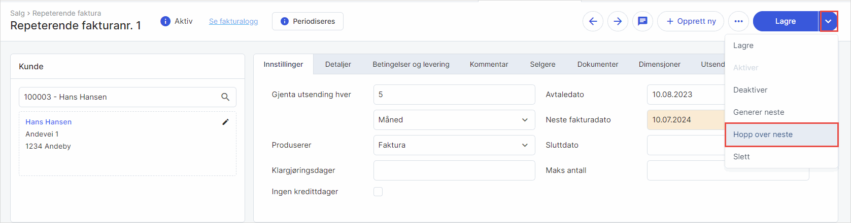 2. Klikk på pilen ved Lagre og velg Hopp over neste. Faktura som skulle blitt generert ved Neste fakturadato, blir da hoppet over og ikke generert.