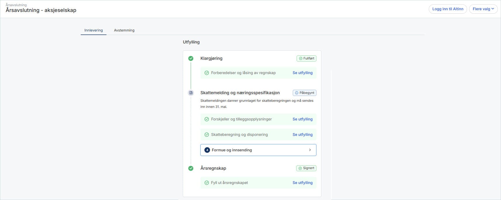 Steg 2, 3 og 4 er en del av skattemeldingen, og alle disse har egne understeg. Steg 5 åpner når steg 3 er fullført, og utfylling og signering av årsregnskapet kan i teorien fullføres før innsending av skattemeldingen. Steg 6 (signer årsregnskapet) blir ikke synlig i oversikten før steg 5 (fyll ut årsregnskapet) er påbegynt.