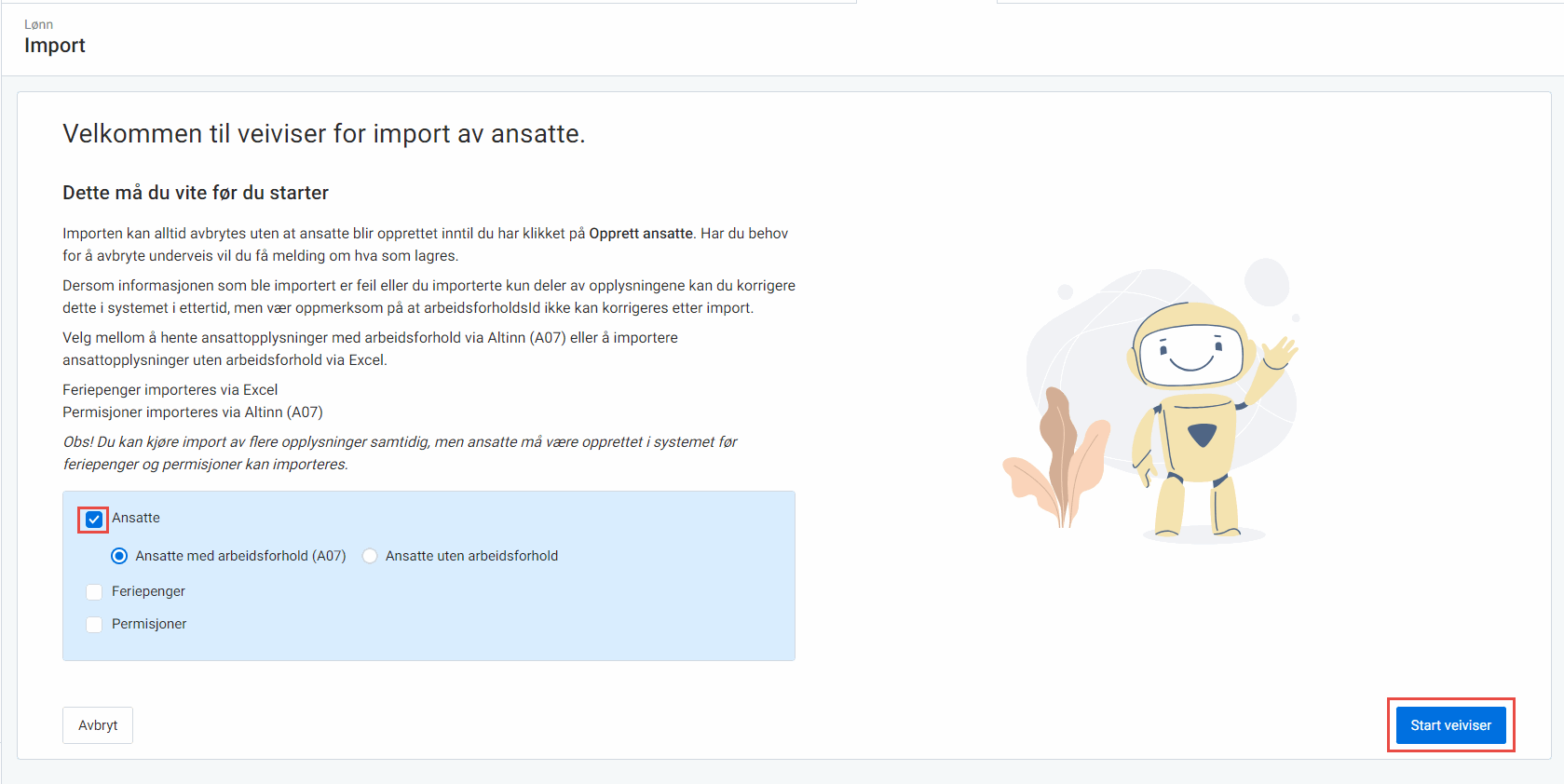 8. Klikk på Start import når du er sikker på at alt er korrekt. Det er ikke mulig å endre arbeidsforholds-ID i etterkant.