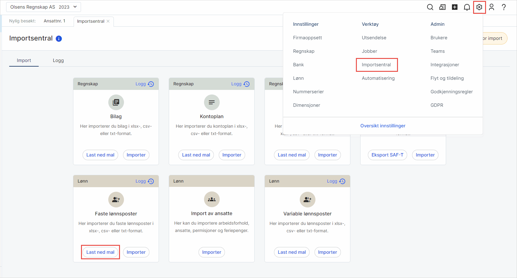 1. Gå til Innstillinger i toppmenyen og klikk på Importsentral