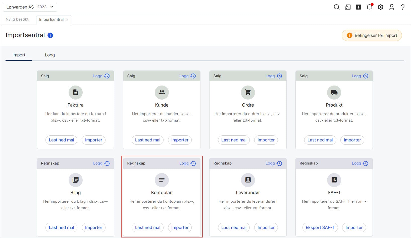 7. Gå tilbake til Importsentralen og Kontoplan og velg Importer.