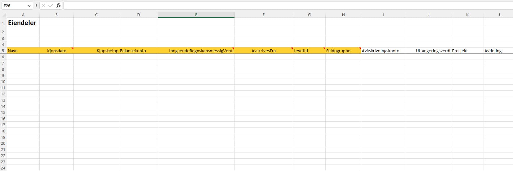 3. Åpne malen og fyll inn informasjon om eiendelene i radene nedover. Kolonnene markert i gul er obligatoriske å fylle ut, resterende er valgfrie. Levetid oppgis i antall måneder. Du kan sveve musepekeren over de røde feltene i overskriftene for mer utfyllende forklaringer til feltene. Husk å lagre filen.