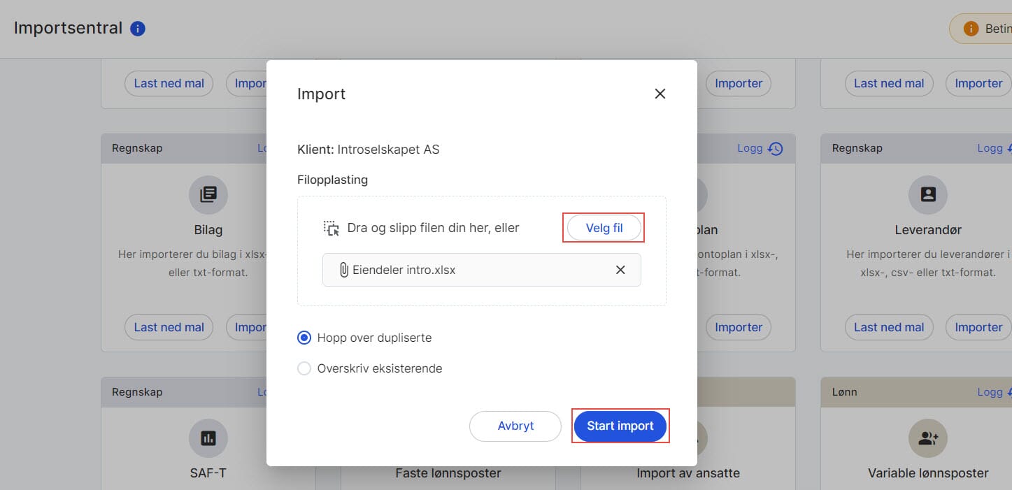 5. Klikk på Velg fil for å laste opp. Du må velge om du vil hoppe over dupliserte eiendeler, eller om du vil overskrive eksisterende eiendeler. Klikk på Start Import.