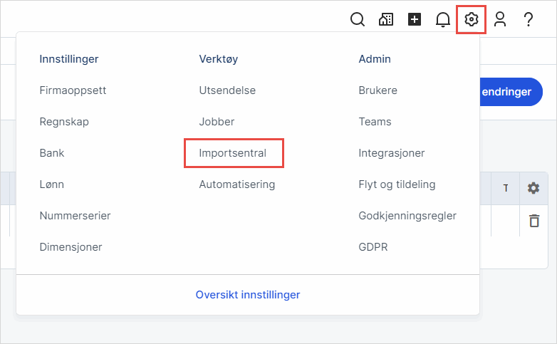 1. Gå til innstillinger i toppmenyen og velg Importsentral.