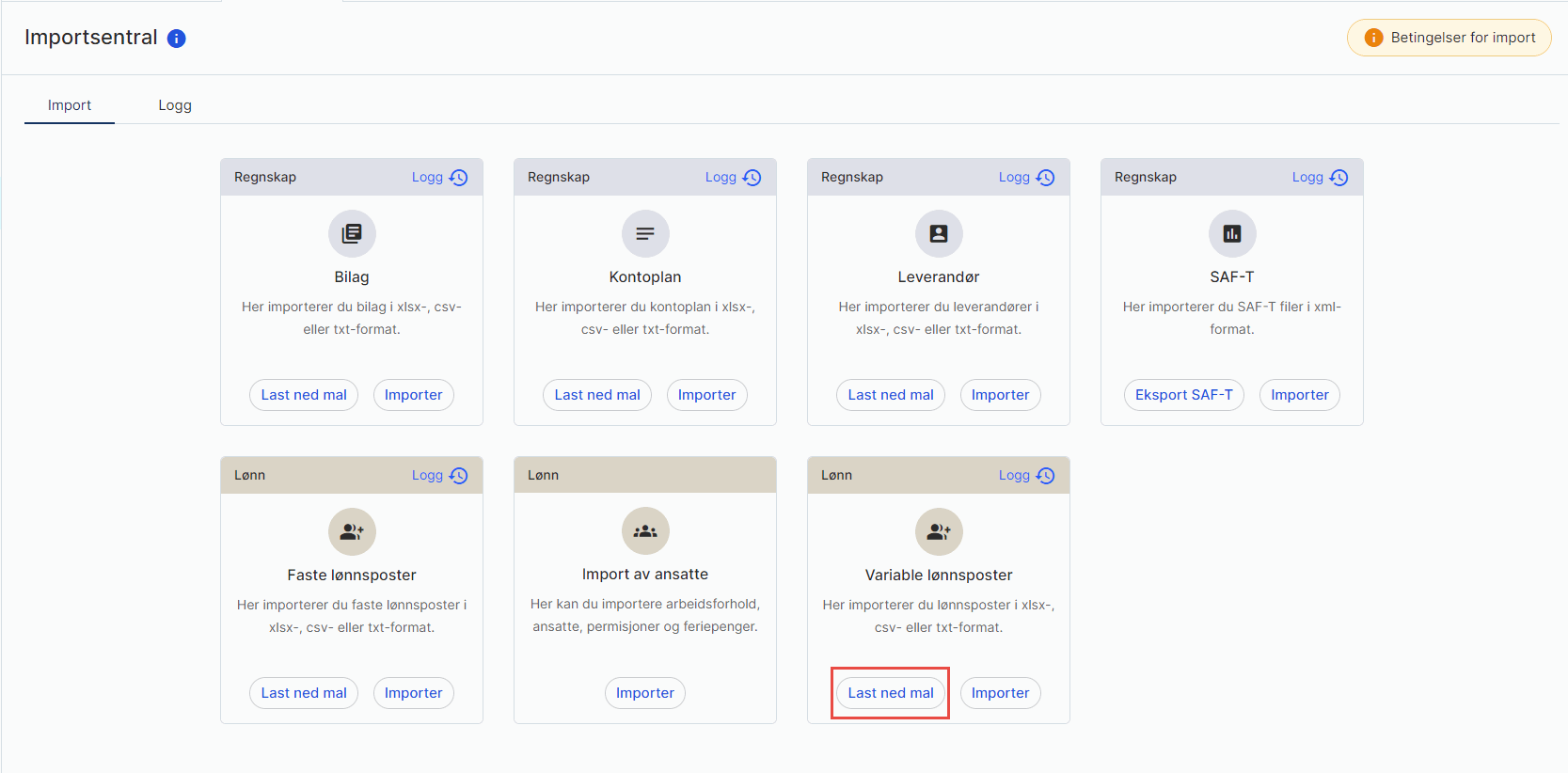 2. Gå til fanen Import og klikk på Last ned mal under Variable lønnsposter.