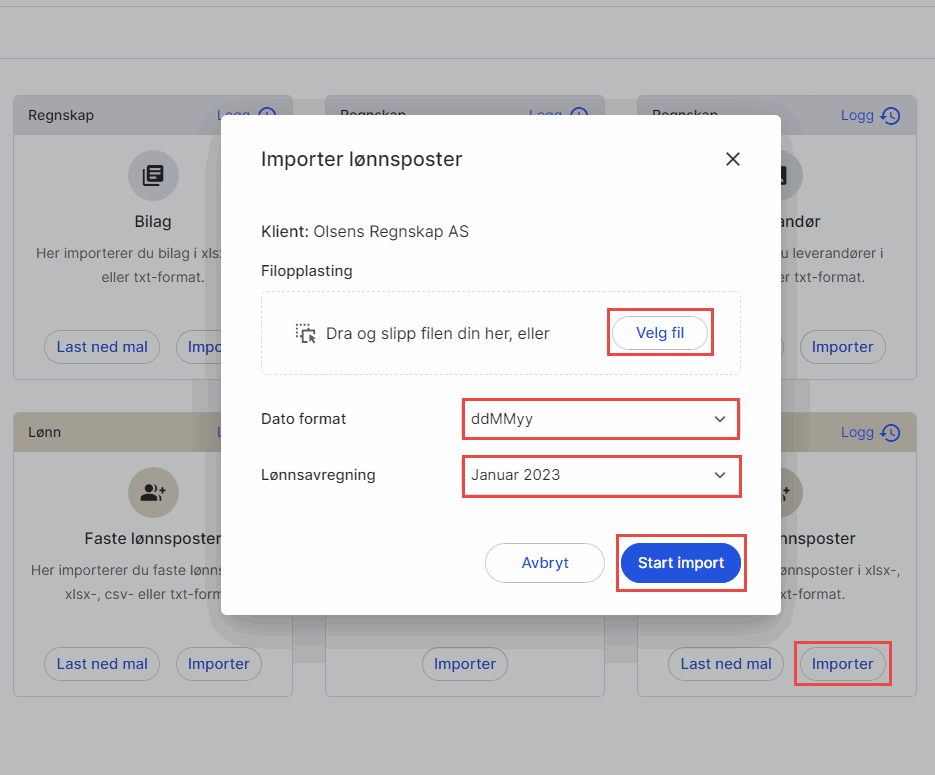 4. Klikk på Importer under Variable lønnsposter. Klikk deretter på Velg fil for å laste opp ferdig utfylt mal. Sett aktuelt datoformat og velg aktuell lønnsavregning. Klikk på Start Import for å importere variable lønnsposter.