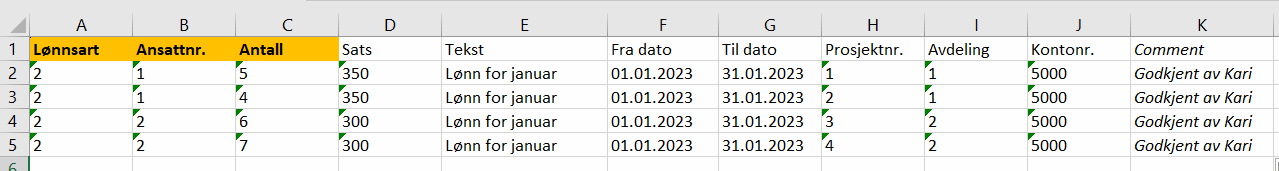 3. Legg inn nødvendig informasjon. Merk at kolonnene Lønnsart, Ansattnr. og Antall er obligatoriske felter i malen.
