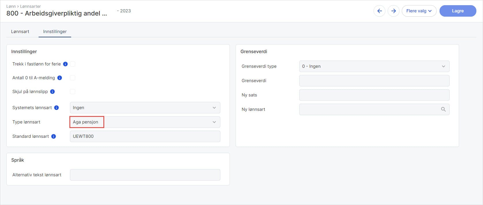 Dersom du klikker på fanen Innstillinger vil du se at Type Lønnsart er satt til Aga pensjon. Dette sørger for at lønnsarten er med på A-meldingen.