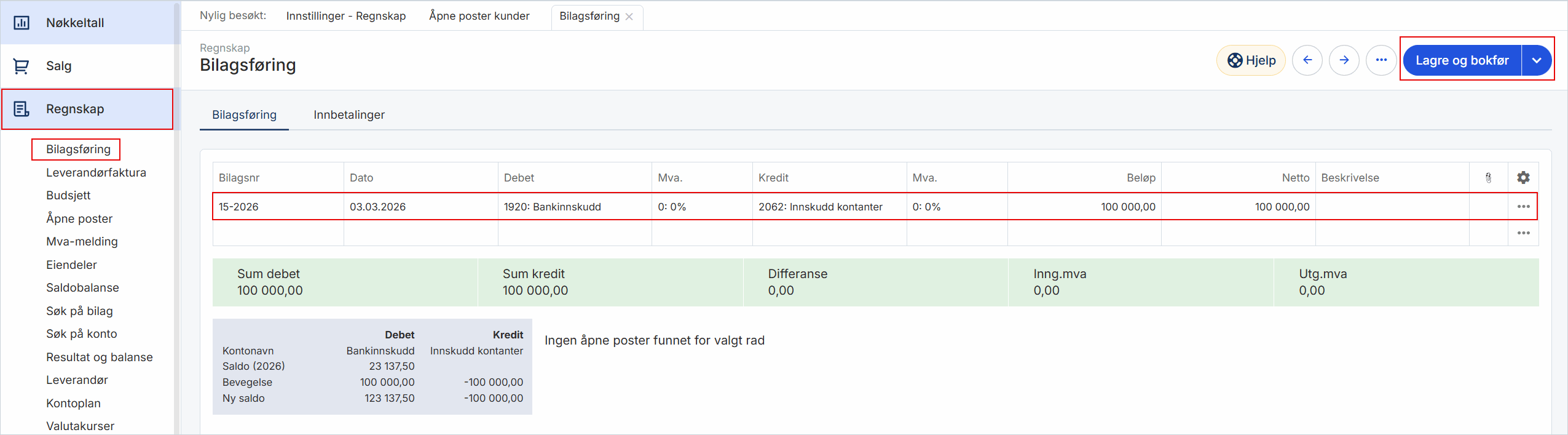 Et typisk eksempel er at eier har satt inn penger på virksomhetens konto. I så fall kan du for eksempel føre 100 000 kroner på debet bank og kredit innskudd kontanter, og trykke Lagre og bokfør.
