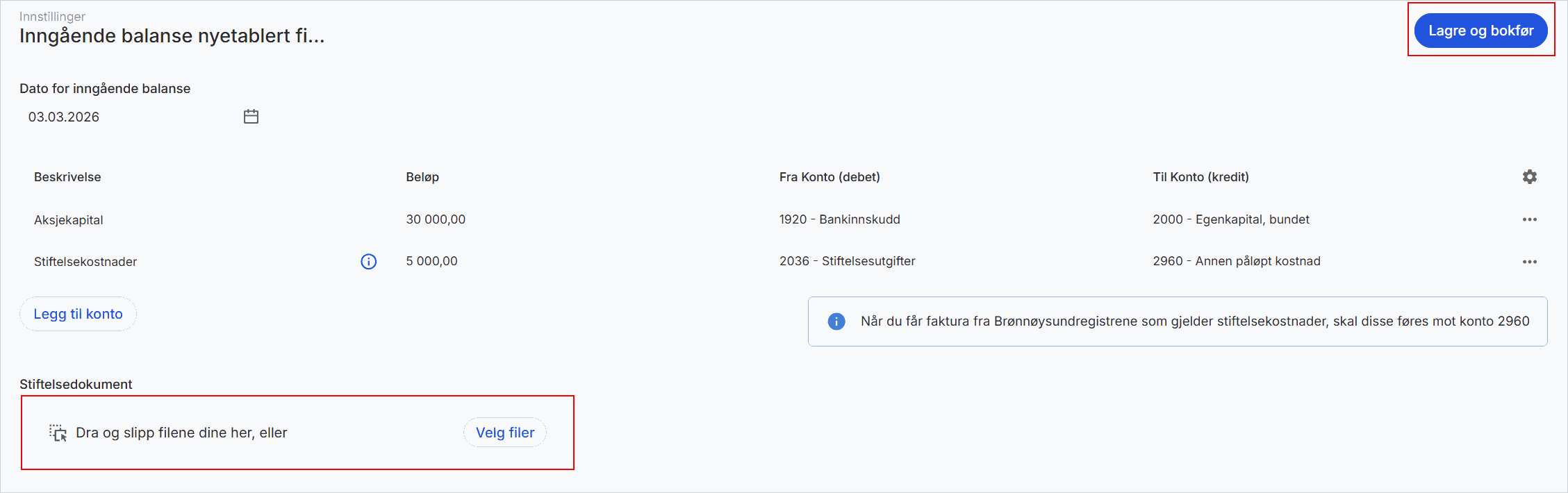 5. Last opp stiftelsesdokumentet, og klikk på Lagre og Bokfør.