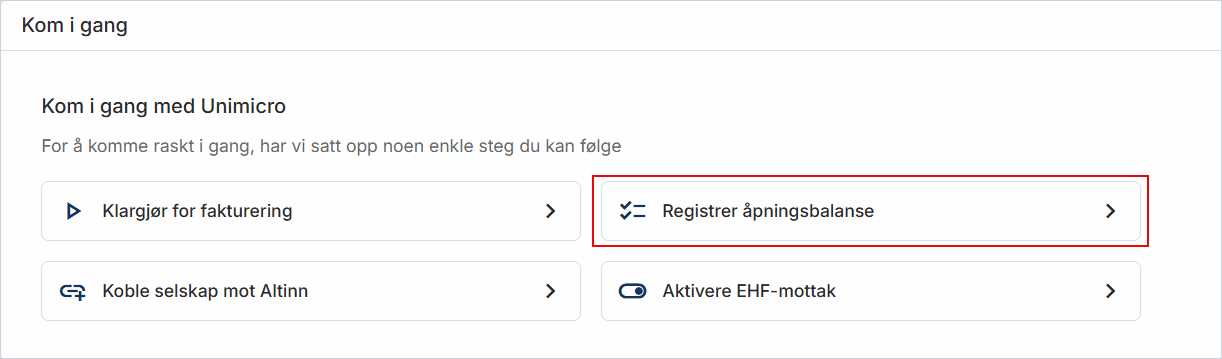1. Når du logger inn i systemet etter at du har opprettet selskapet, vil du få opp en oppstartsveiviser med steg du kan følge for å komme i gang i systemet. Klikk på Registrer åpningsbalanse.