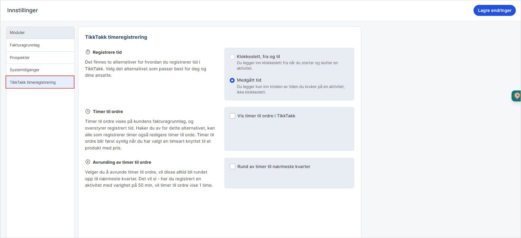 Gå til Innstillinger i toppmenyen og velg TikkTakk timeregistrering . Her kan du angi om du ønsker å registrere timer som medgått tid eller fra-til tidspunkt, om timer til ordre skal være synlig og om du ønsker at timer til ordre skal rundes opp (men ikke ned) til nærmeste kvarter.