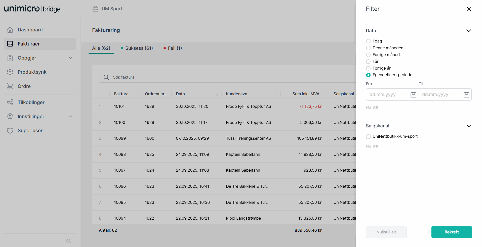 Denne siden gir deg oversikt over alle fakturaer som er opprettet via Unimicro Bridge, etter at ordre fra nettbutikken er trukket og overført til regnskapet.