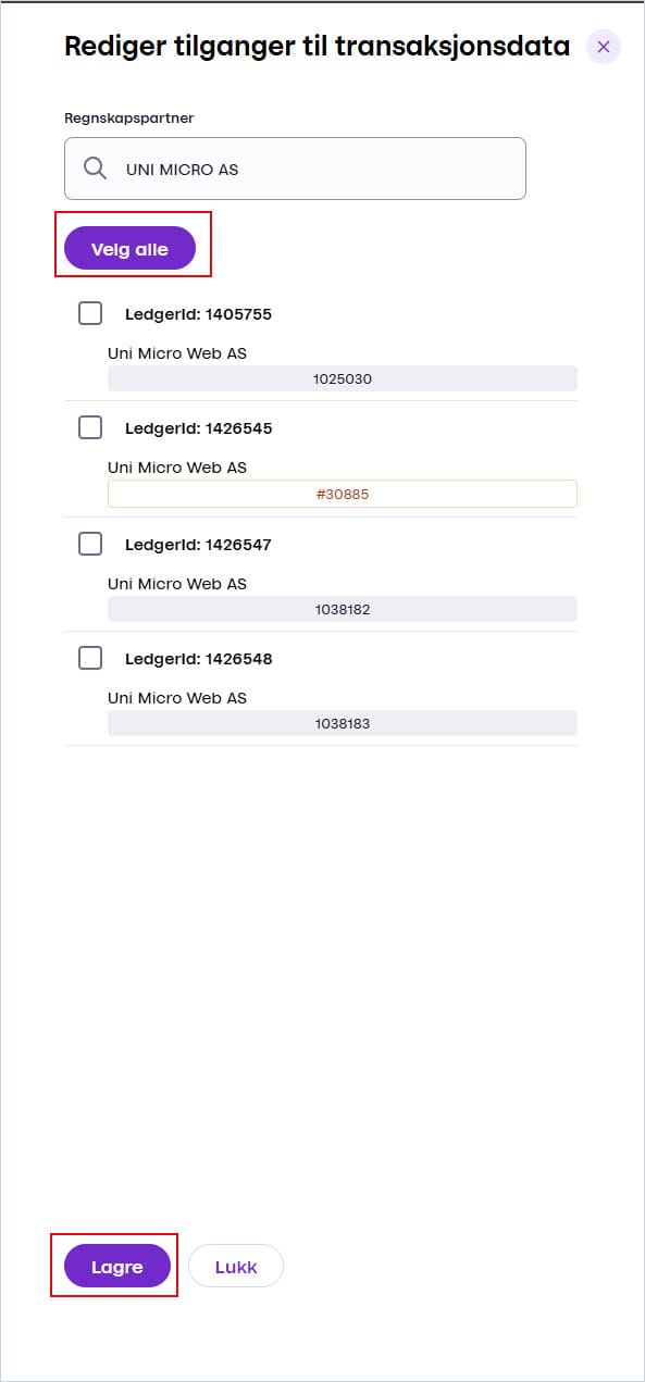 Søk på Uni Micro AS i feltet for regnskapspartner. Om du har flere MSN (Merchant Serial Number), kan du klikke på Velg alle eller sett hake ved de aktuelle som skal ha Uni Micro AS som regnskapspartner. Husk å klikk Lagre.