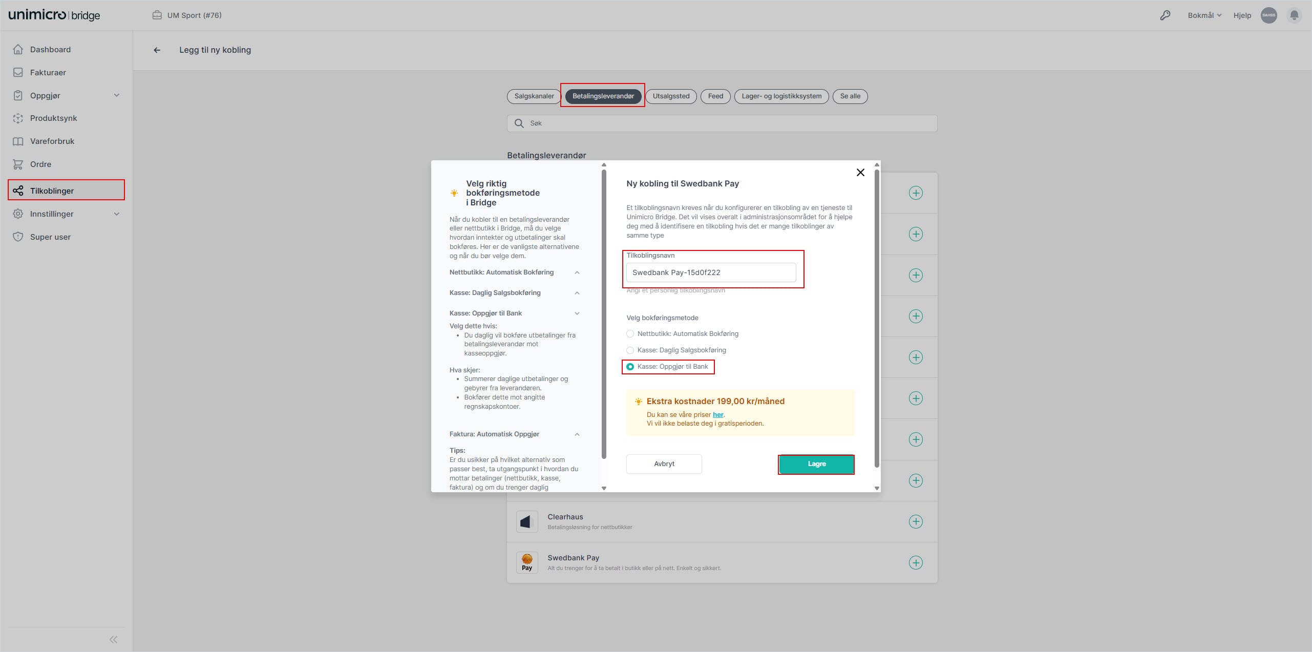 Det kommer opp forslag til tilkoblingsnavn, og velg bokføringsmetode "Kasse: Oppgjør til bank". Klikk Lagre.