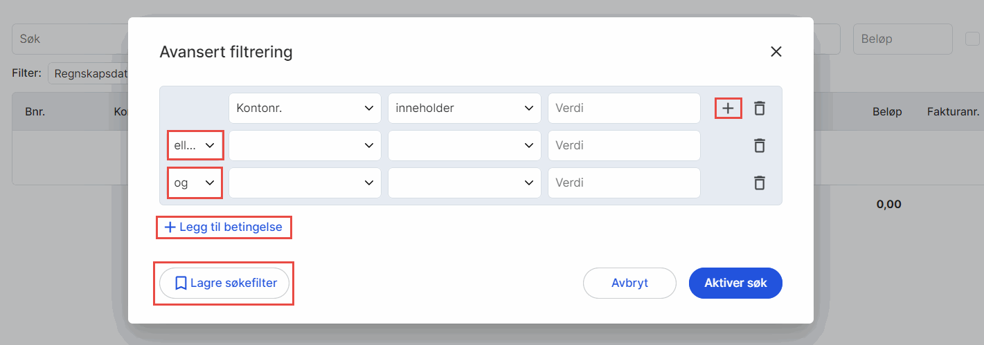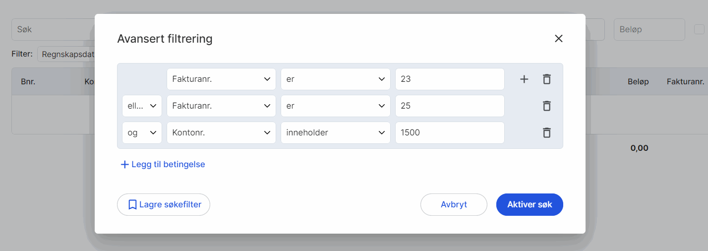 3. I filtreringen kan du sette opp flere betingelser. Betingelsene skilles mellom og og eller. Hvis du bruker og, må begge kriteriene være oppfylt for at linjene skal vises i søket. Hvis du bruker eller, holder det at ett av kriteriene er oppfylt for at linjen skal vises.