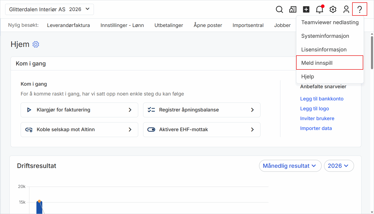 1. Klikk på Lisensinformasjon og support i toppmenyen og velg Meld innspill. Passord og brukernavn for innlogging er det samme du bruker på Unimicro.