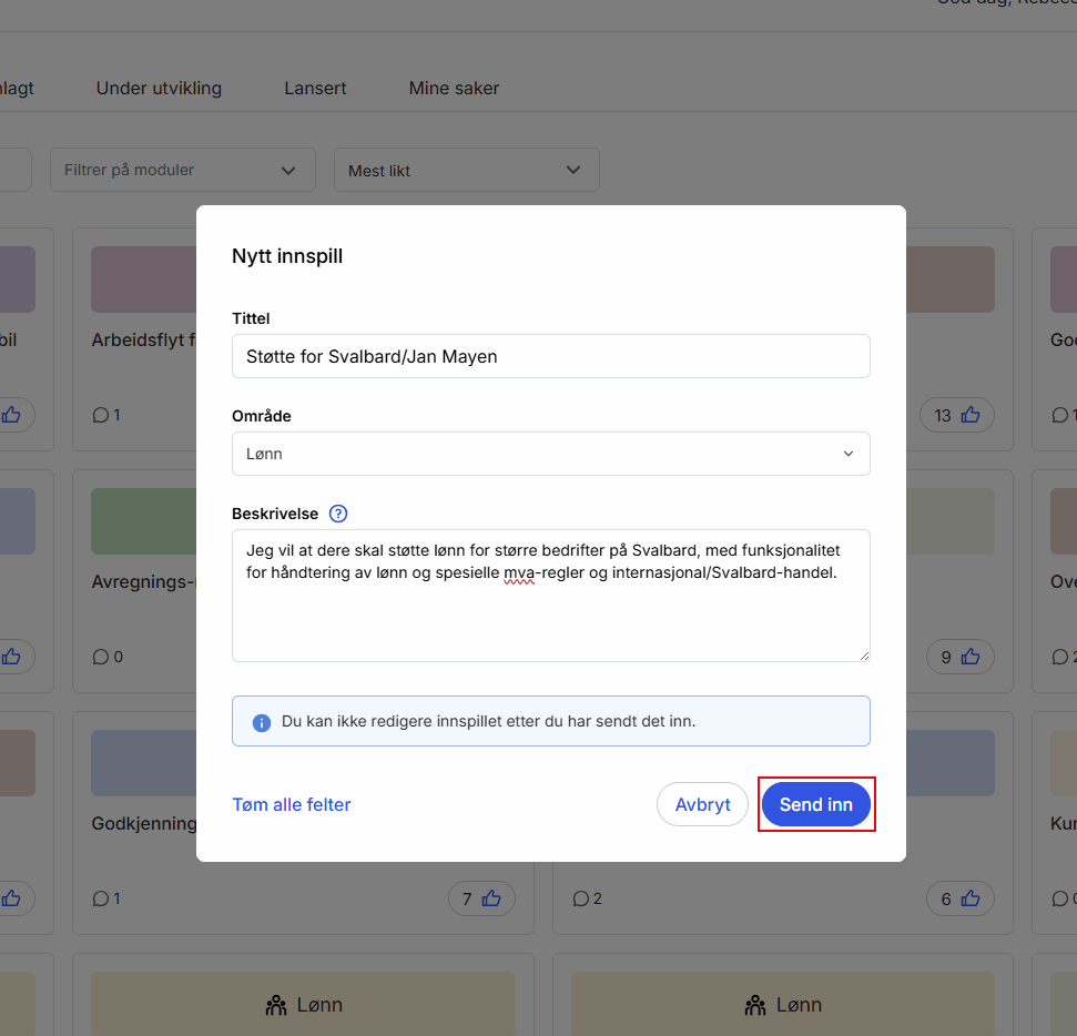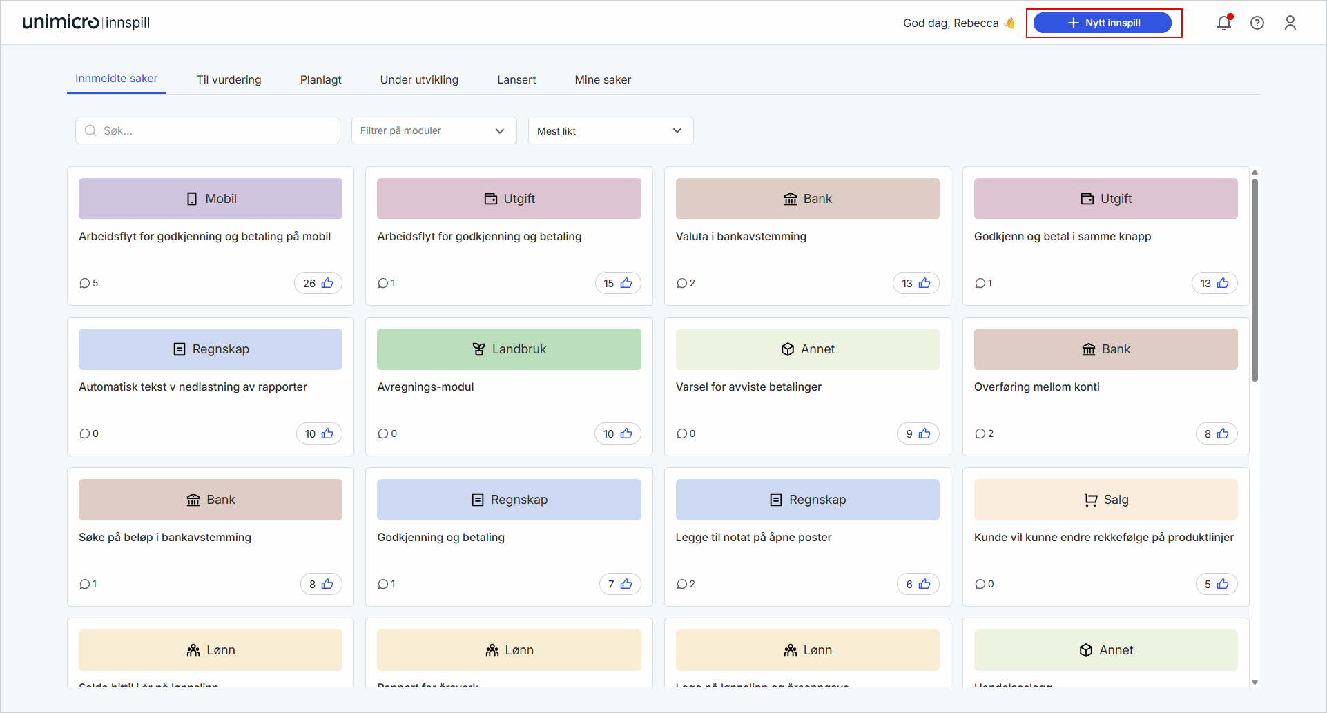 Hvis du ønsker å rapportere endrings- eller forbedringsønsker til systemet, kan du gjøre det ved å gå til Unimico Innspill via en lenke i systemet.