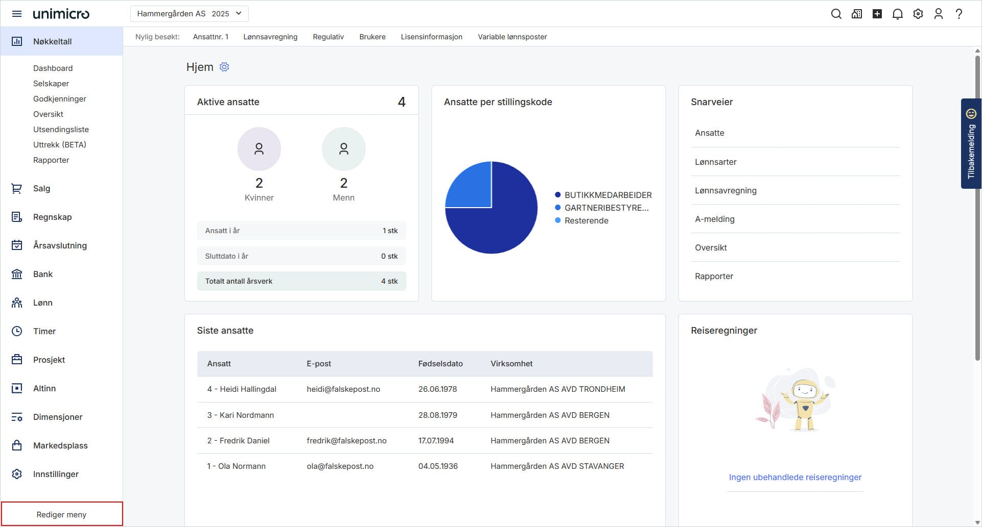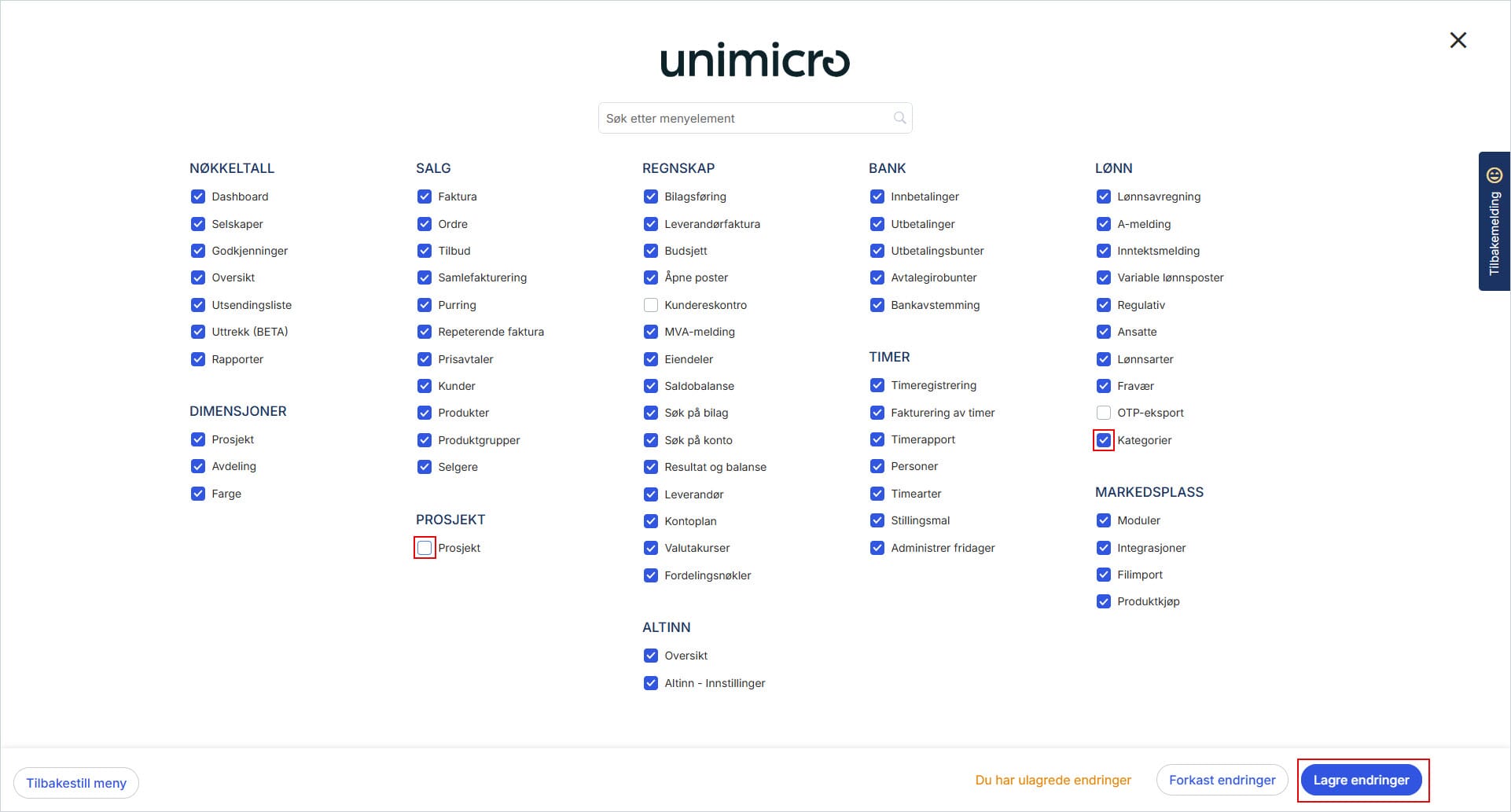 2. Sett hake for å legge til eller ta bort hake for å ta bort funksjon fra venstremenyen. Du endrer venstremenyen for din personlige bruker, og venstremenyen vil se slik ut så lenge du ikke sletter cookies eller logger på en annen enhet. Funksjonene du har tilgjengelig vil variere i forhold til dine brukerroller og/eller funksjoner du har kjøpt tilgang til.