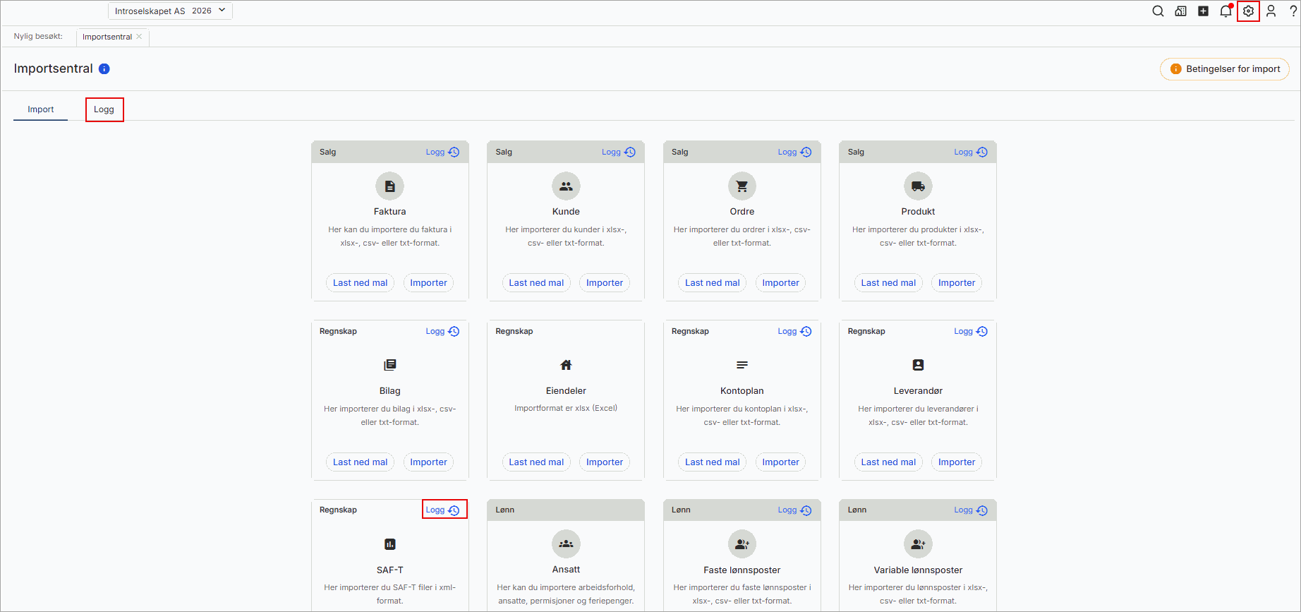 2. Klikk på fanen Logg, eller bla ned til feltet for SAF-T-import og klikk på Logg.