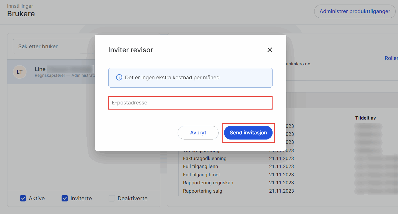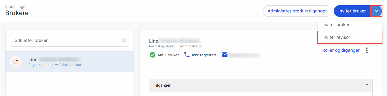 Invitere revisor Sist oppdatert 23.12.2025 1. Gå til Innstillinger i toppmenyen og velg Brukere. 2. Klikk på pilen til høyre for Inviter bruker. 3. Velg Inviter revisor. 4. Legg inn revisors e-postadresse og klikk på Send invitasjon.