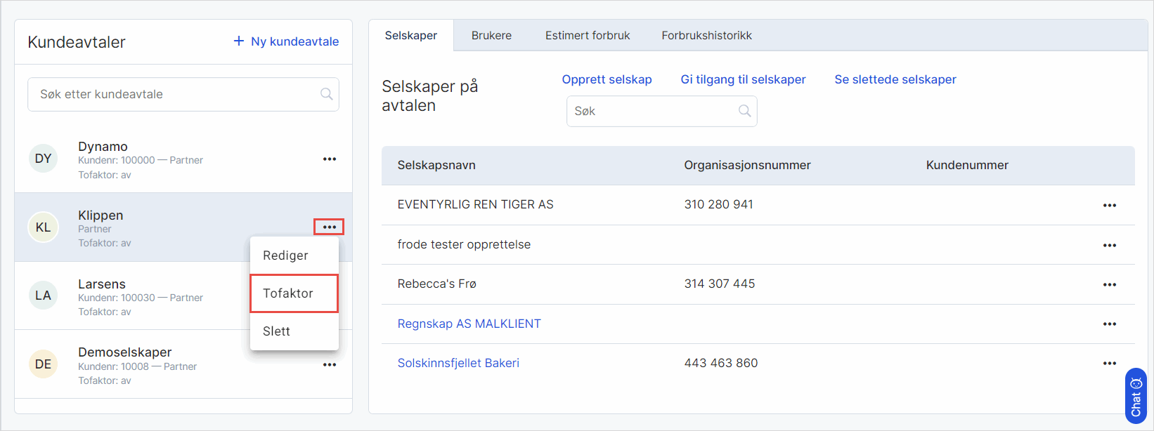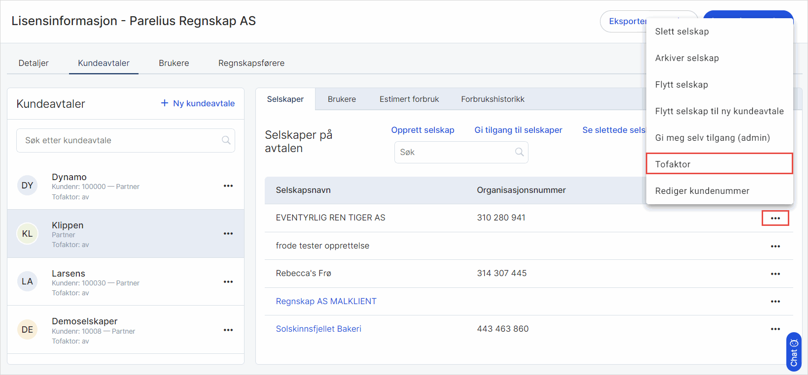 Velg kundeavtalen som inneholder det spesifikke selskapet. Klikk på de tre kulepunktene og velg Tofaktor.
