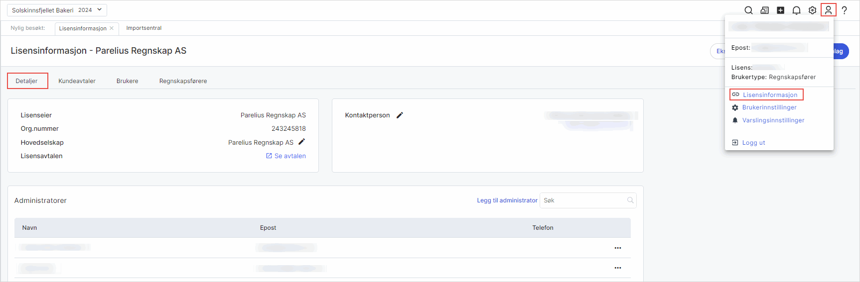 - Kontaktperson: Kontaktperson på lisensavtalen. Denne kan endres direkte i systemet.