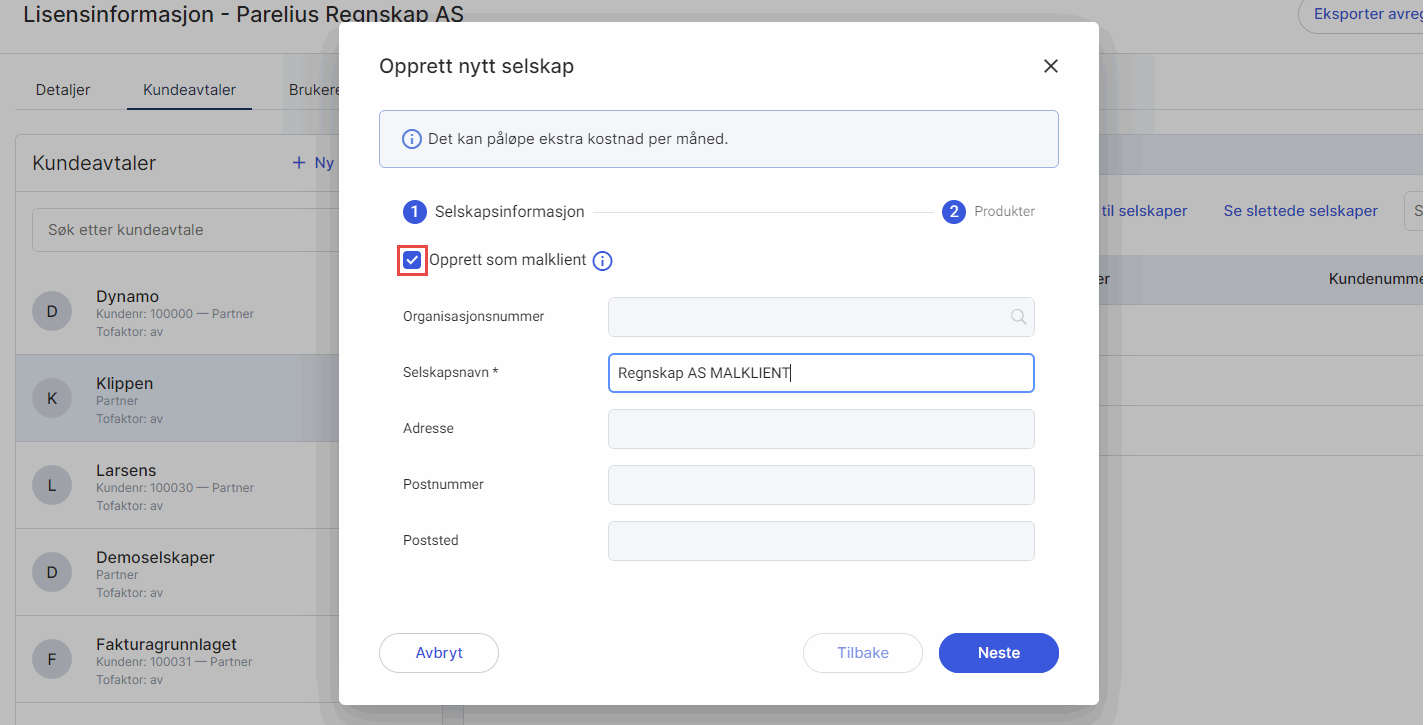 En malklient kan kun opprettes i forbindelse med opprettelse av et nytt selskap. Sett hake ved Opprett som malklient i første steg.