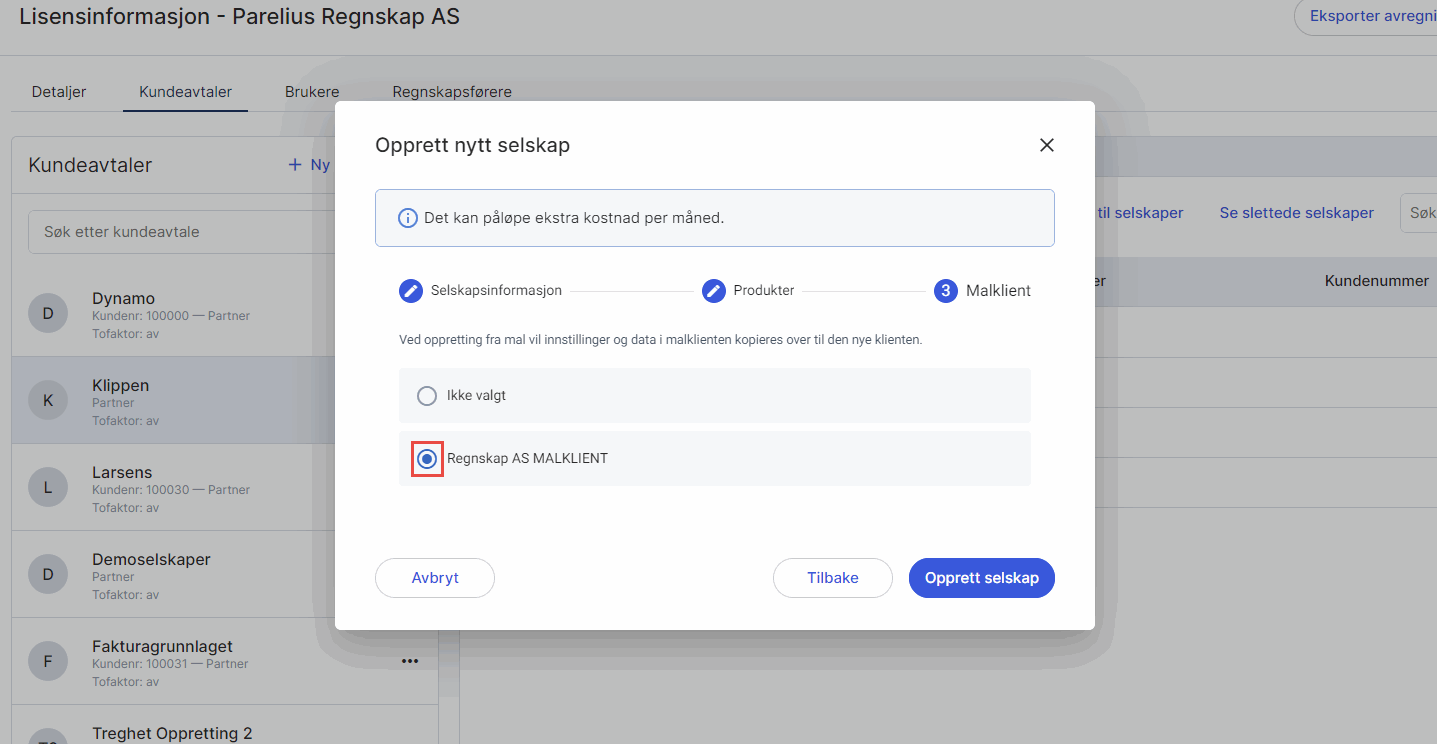 Neste gang du oppretter et nytt selskap, kan du velge å basere selskapet på eksisterende malklient. Alle innstillinger i malklienten vil overføres.