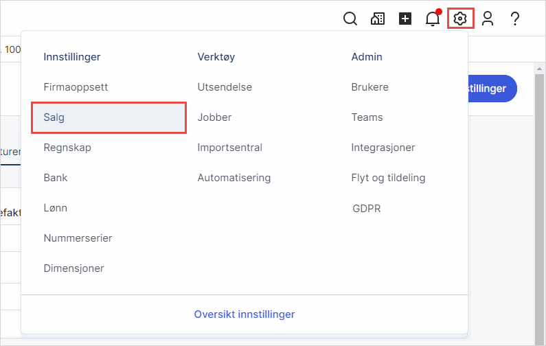 1. Gå til innstillinger i toppmenyen og velg Salg. Klikk på Viderefakturering.