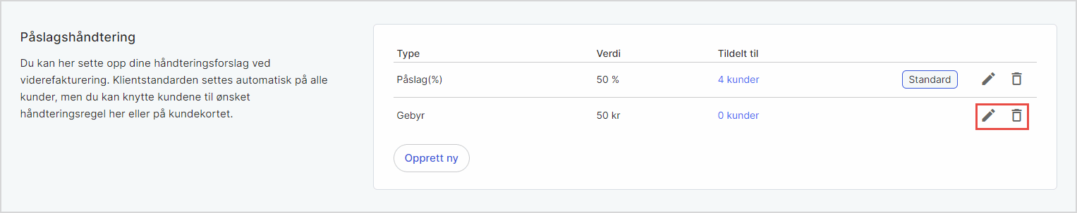 4. Sett prosentsats for påslag, eller fastpris for gebyr i feltet under Verdi. Sett hake ved Sett som standard dersom du ønsker at avtalen skal være standard på alle kunder. Klikk på Opprett.