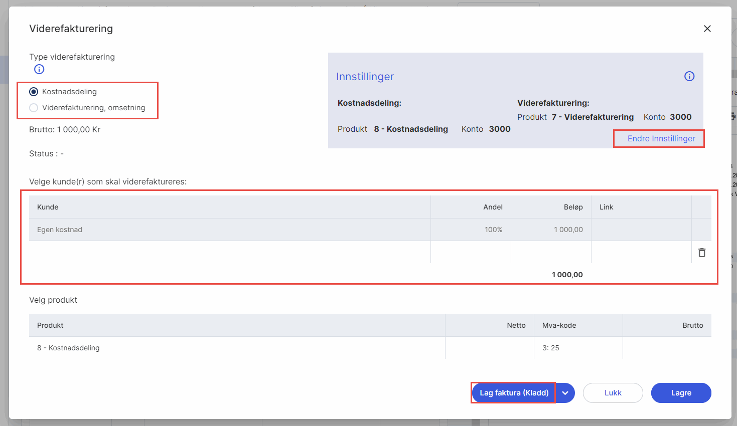 3. Klikk på Endre innstillinger for å legge til detaljer og endre viderefaktureringen. Legg inn standard produktnummer for kostnadsdeling og viderefakturering, og velg om du ønsker å lage fakturakladd, generere en ordre, eller fakturere direkte.