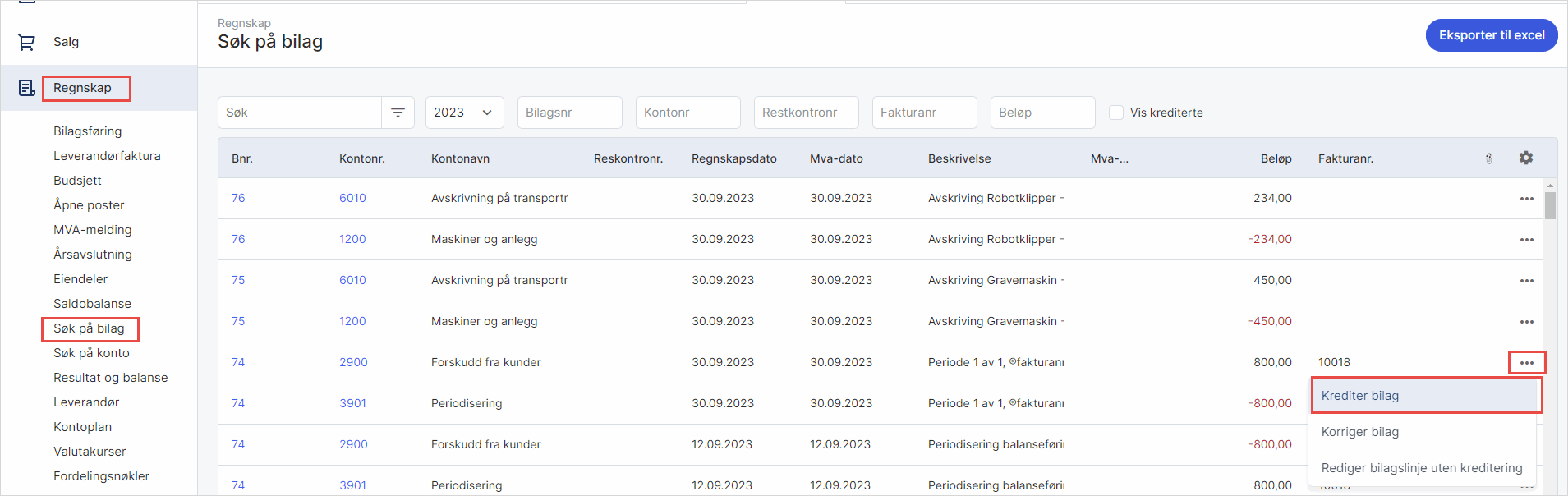 2. Klikk på de tre kulepunktene på bilagslinjen som skal krediteres. Velg Krediter bilag.