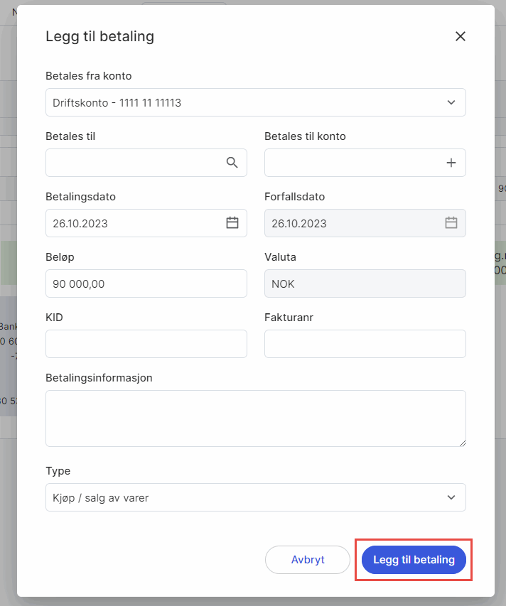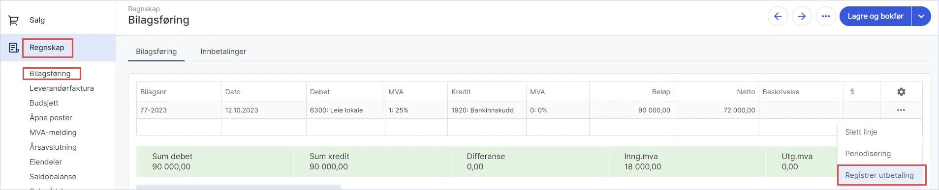 Legge bilag til betaling Sist oppdatert 06.01.2026 1. Gå til Regnskap i venstremenyen og klikk på Bilagsføring. 2. Klikk på de tre kulepunktene og velg Registrer utbetaling. 3. Registrer relevant betalingsinformasjon. Klikk på Legg til betaling. 4. Lagre og bokfør bilaget.