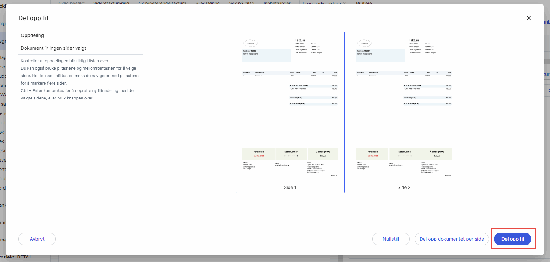 Merk at det kun er rene PDF-filer som kan deles opp. En inngående EHF som vises som PDF, eller som er slått sammen med en PDF, vil ikke kunne deles.