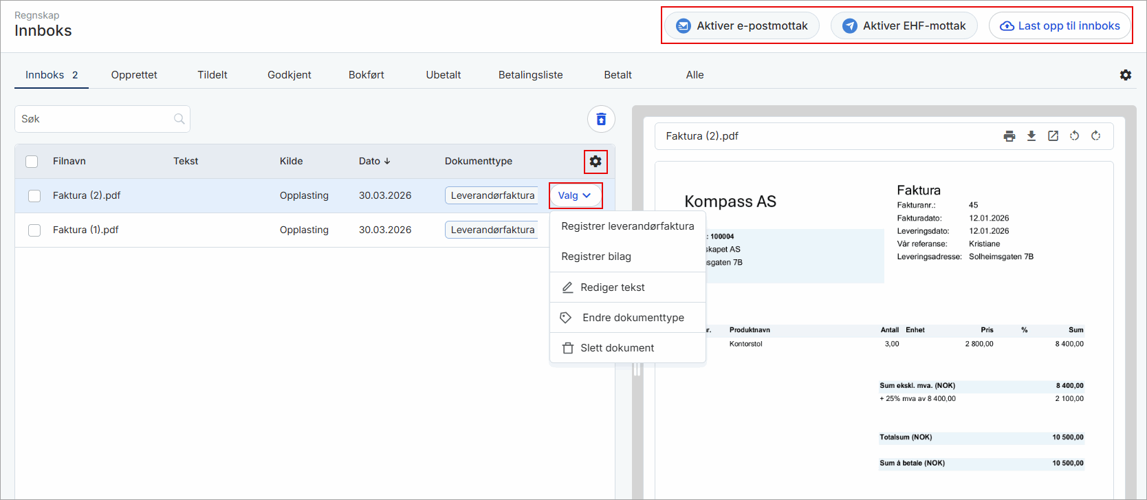 Du kan aktivere e-postmottak og EHF-mottak direkte fra innboksen dersom dette ikke allerede er gjort. Du kan også laste opp filer direkte til innboksen fra din PC.