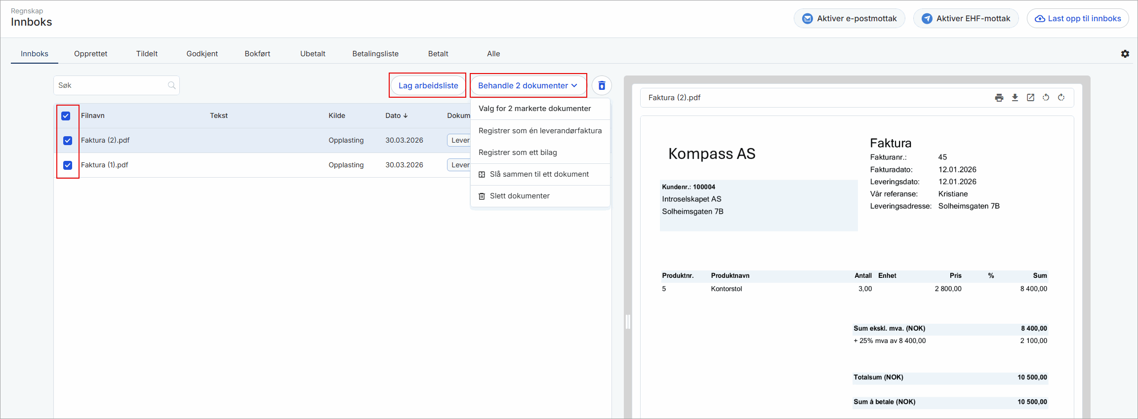 Ved å markere mer enn én fil i innboksen, vil valgene Lag arbeidsliste og Behandle x dokumenter bli synlig. Klikk på Registrer som én leverandørfaktura eller Registrer som ett bilag for å registrere filene samlet. Filene blir ikke slått sammen til én fil, de vil legge seg som to separate vedlegg i leverandørfaktura og på bilaget. Ønsker du å slå dem sammen til én fil, klikker du på Slå sammen til ett dokument.