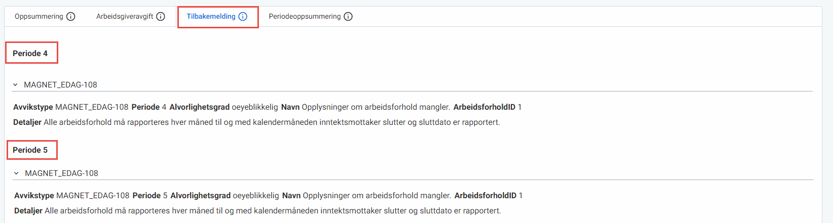 Merk: Altinn kommer til å gi deg tilbakemelding både for perioden du sender inn i tillegg til perioden etter. Dette er grunnen til at perioden ikke får grønn hake til tross for at det ikke er feil i perioden. Du trenger ikke å foreta deg noe for å løse dette. Hvis du imidlertid ønsker en grønn hake på alle perioder kan du løse dette ved å sende inn en erstatningsmelding for perioden før, etter at du har hentet tilbakemelding for perioden senere. Eksempel: etter å ha sendt inn og hentet tilbakemelding på periode 5 uten feil, kan du sende en erstatningsmelding for periode 4. Dette må du da gjenta fram til nyeste periode.