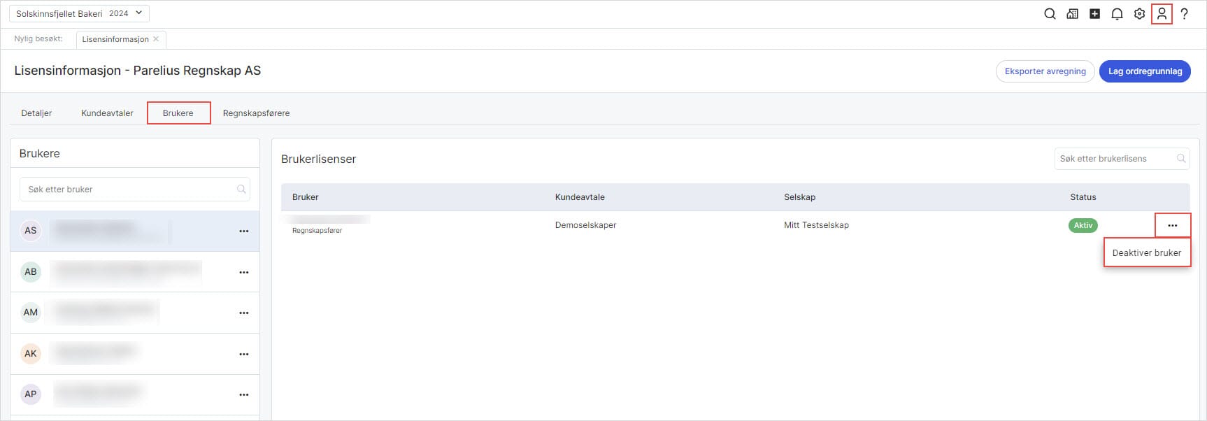 Ønsker du å deaktivere brukeren fra alle selskaper vedkommende har tilgang til, kan du klikke på tre kulepunktene ved aktuell bruker og velge Deaktiver bruker fra alle selskaper.