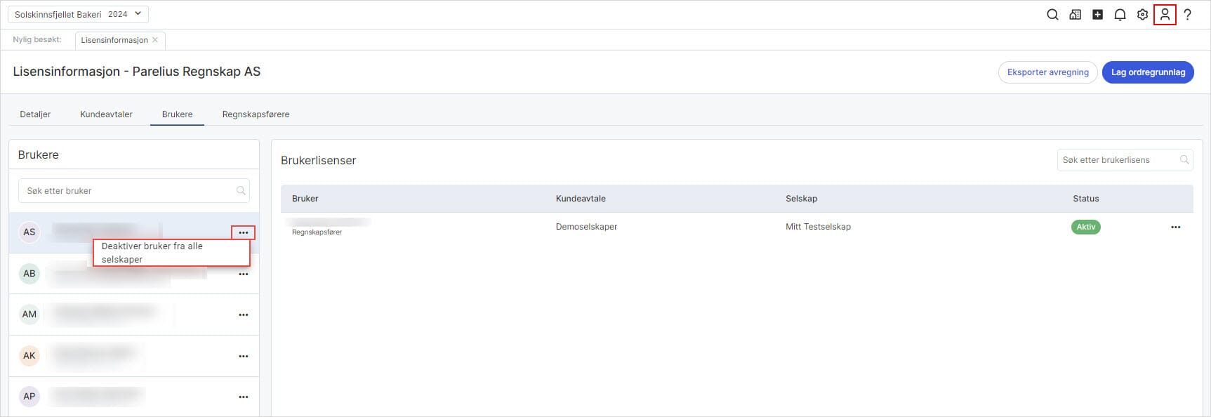 Du kan deaktivere en bruker hvis du er lisensadministrator, enten per selskap eller fra alle selskaper.