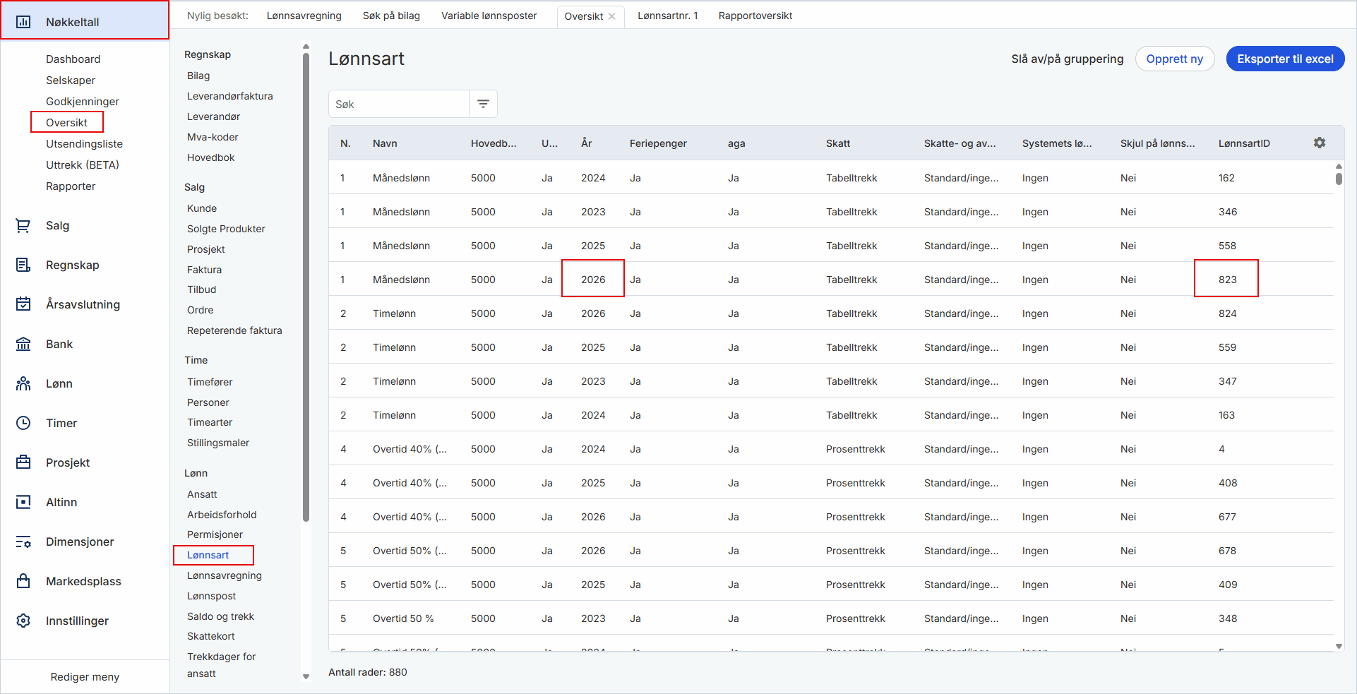 Bruk denne oversikten til å sammenligne årstall med lønnsartID på den lønnsarten du mistenker feil ved. Du kan også få opp lønnsartID i oversikten for lønnsposter hvis du vil se lønnsartID per lønnspost på en lønnskjøring.