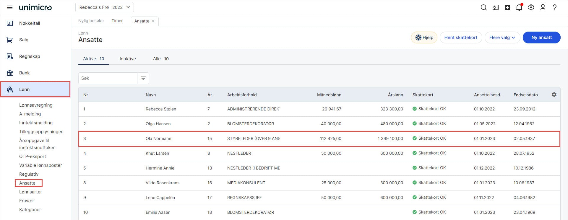 1. Gå til Lønn i venstremenyen og velg Ansatte. Klikk på den ansatte du ønsker å legge inn reskontro på.