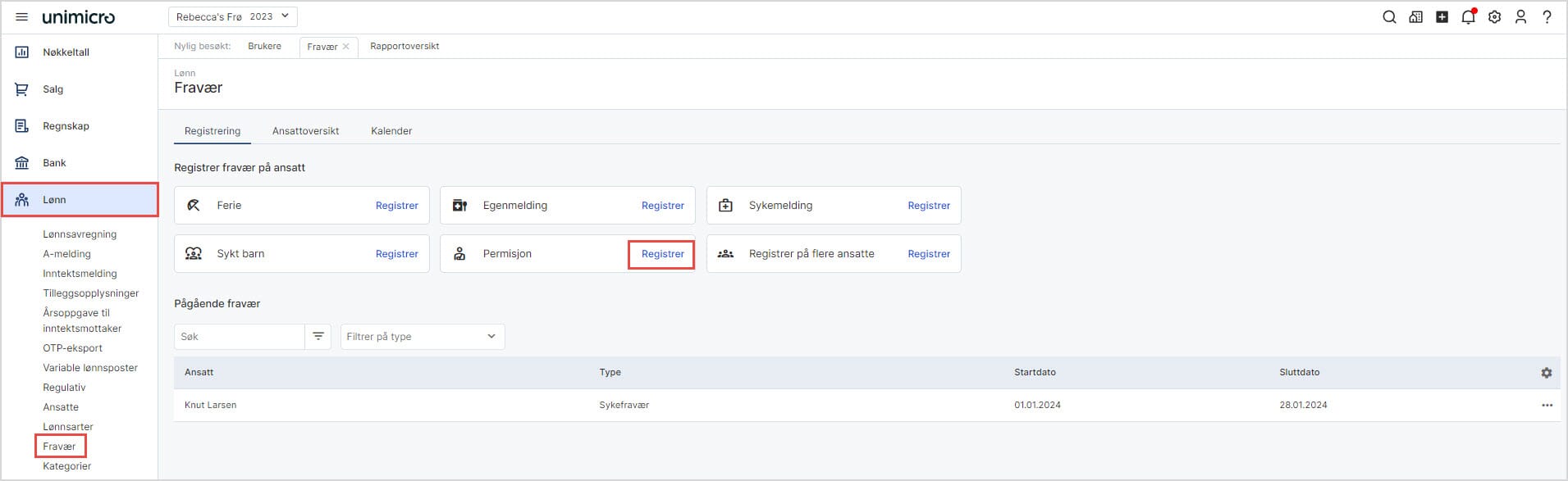 Permisjon kan registreres via ansattkortet, eller via utvidelsen Fravær dersom dette er aktivert via Markedsplassen i systemet.