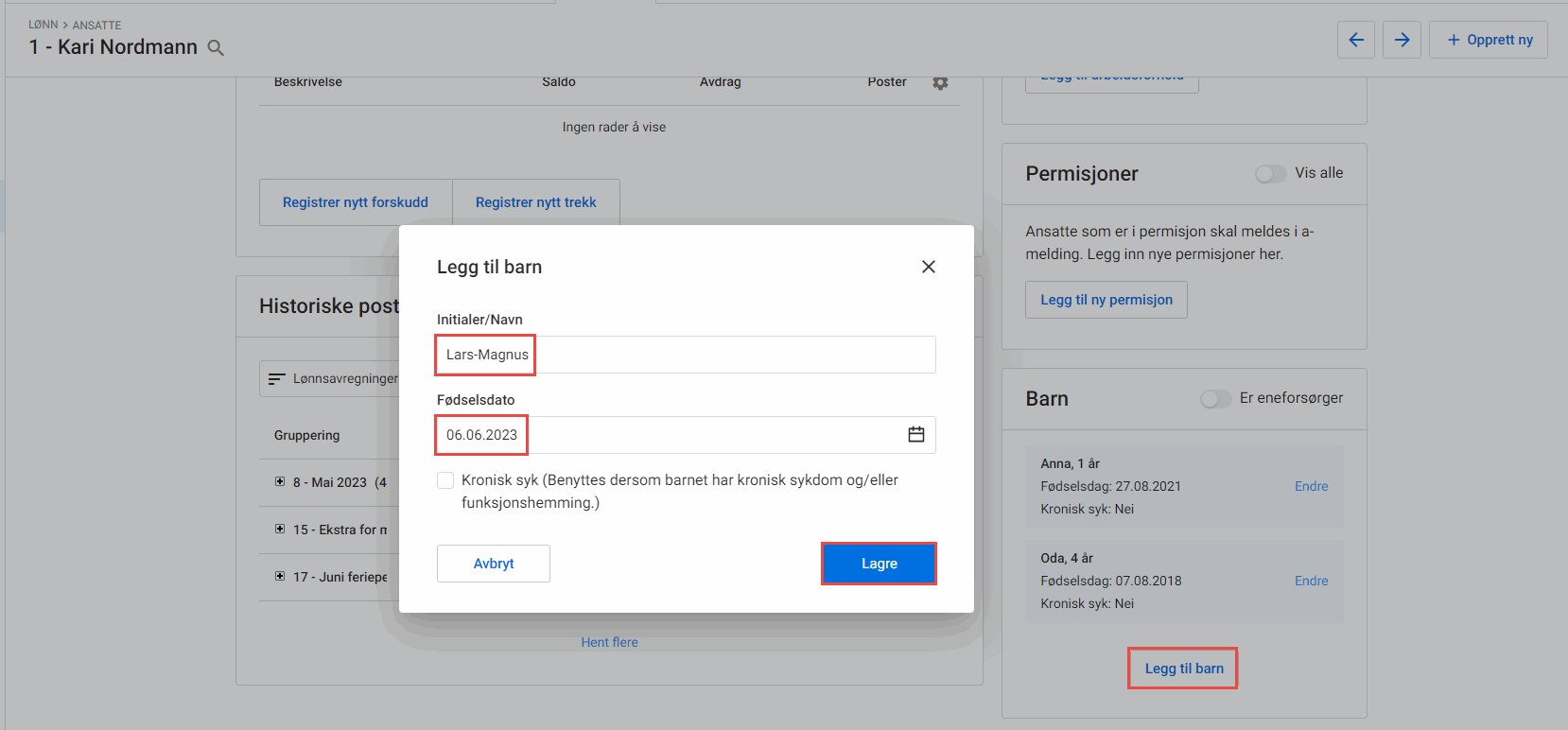 2. Klikk på aktuell ansatt som skal registreres med barn