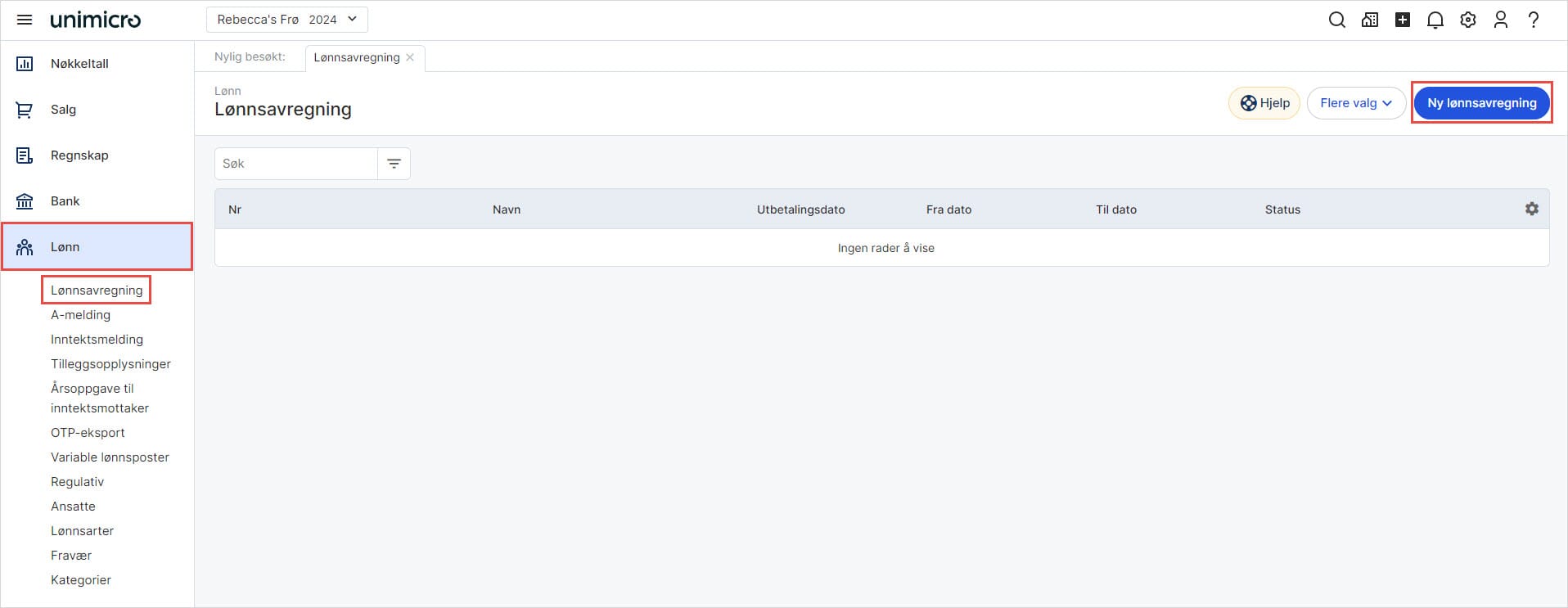 1. Gå til Lønn i venstremenyen og klikk Lønnsavregning. Velg Ny lønnsavregning.