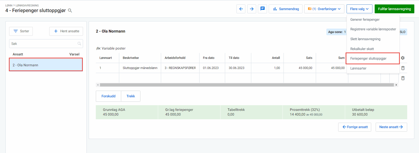 4. Klikk på Flere valg og velg Feriepenger sluttoppgjør.