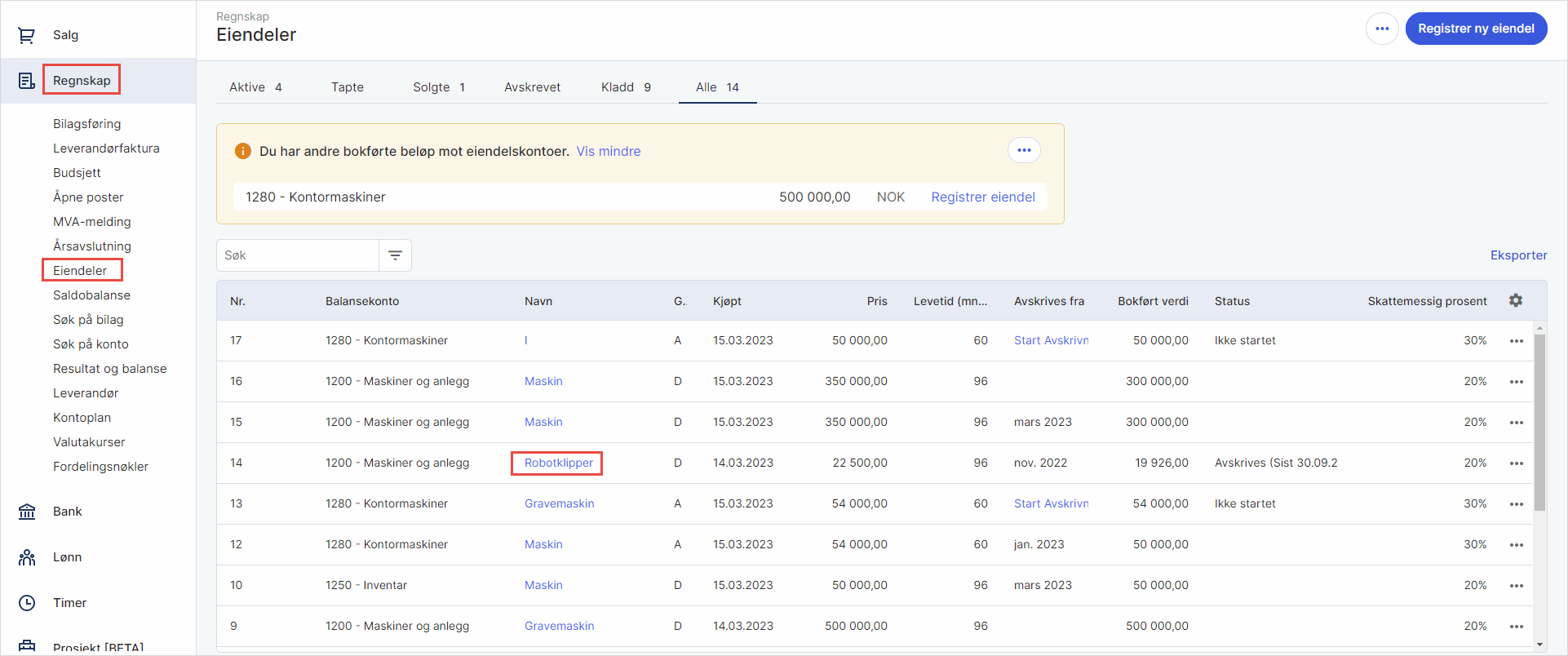 1. Gå til Regnskap i venstremenyen og velg Eiendeler.